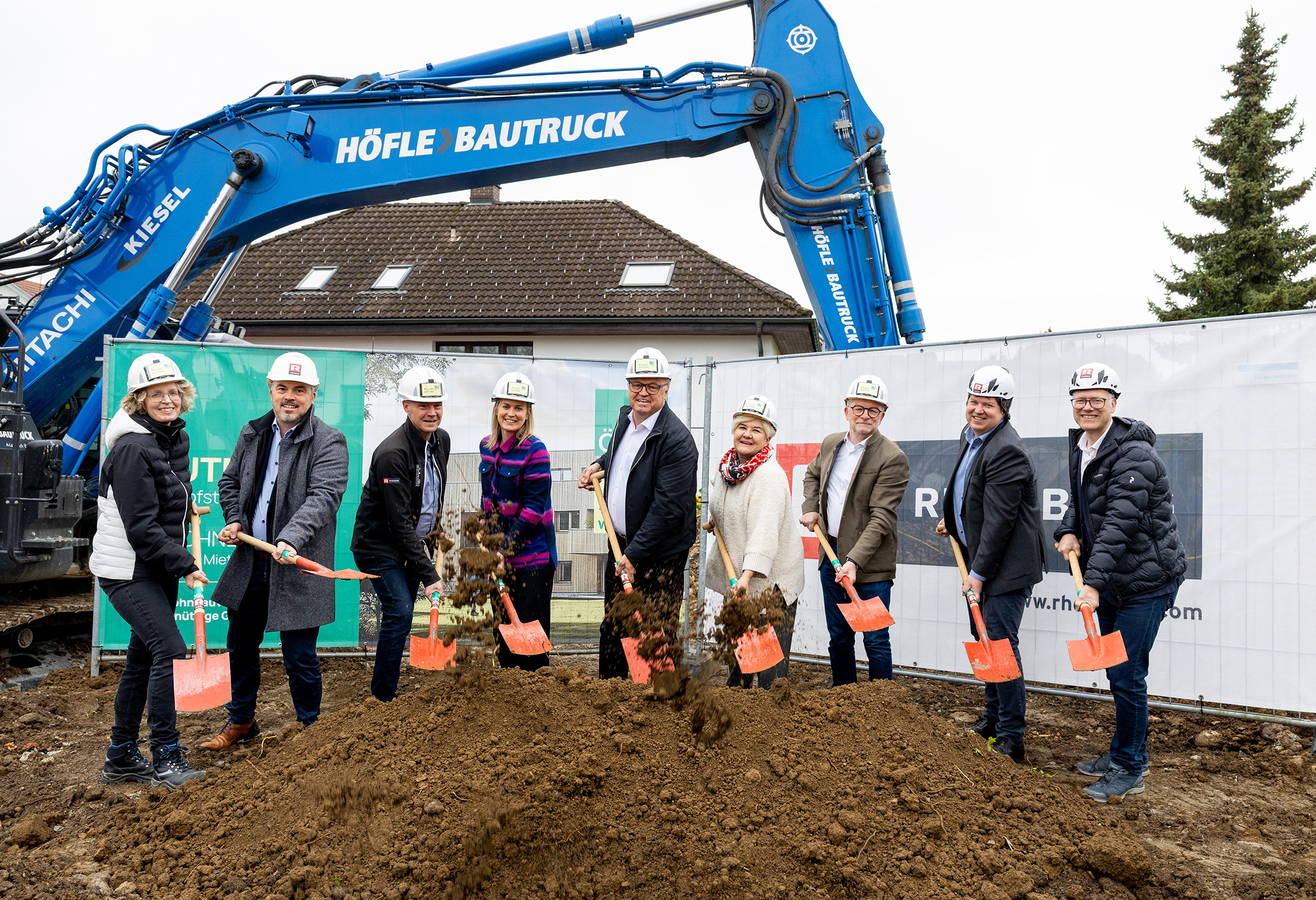 Bregenz/Lauterach, 14. April 2026. Die ÖSW WBV errichtet mit Rhomberg Bau als Generalunternehmer in der Lauteracher Bahnhofstraße 20 ein Gebäude mit 16 geförderten Miet- /Mietkaufwohnungen und rund 1 040 m² Wohnnutzfläche. Am gestrigen Montag feierte sie mit prominenten Gästen wie Lauterachs Bürgermeister Elmar Rhomberg den offiziellen Spatenstich.